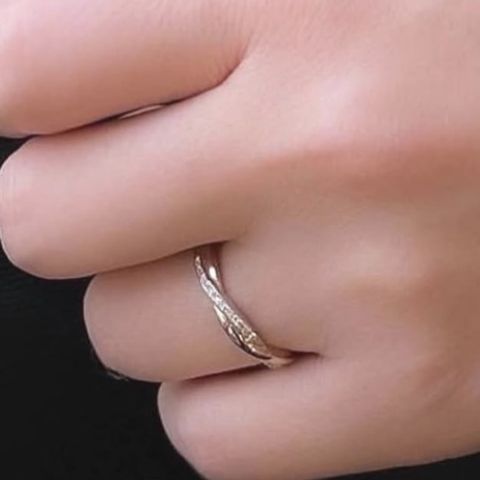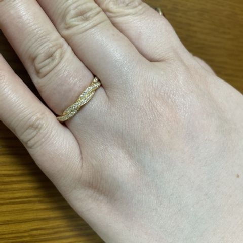 ウェーブのかかっている形なので、指が長く見えるとのこと。すごく軽く、つけた感じが全くしないのかいいです。 ダイヤが5つ付いているのでキラキラするのがすごくかわいいですが、そこまで派手すぎず、長年つけられるところがいいです。