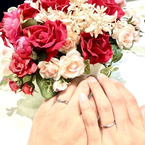 指輪について全然知識がなかったのですが、リング自体、加工など様々な組み合わせのものを実際に試着して、自分たちの気に入った組み合わせを見出すことができました。着けてみても手にフィットしており、とても良い感じです。
