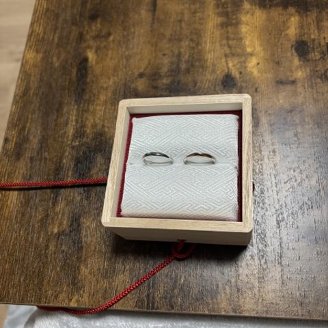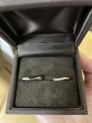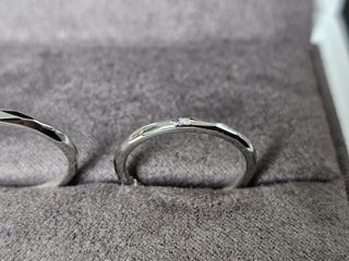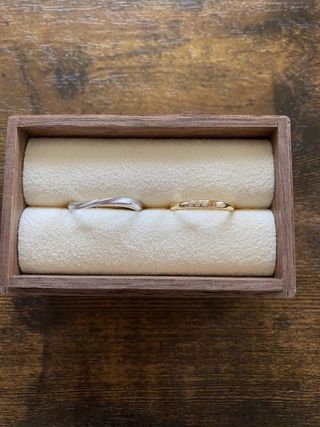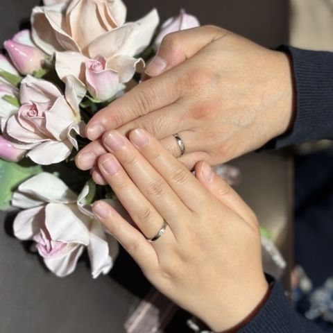 ・日常使いできるシンプルなデザインであること ・予算1人15万以内であること ・女性用はダイヤが控えめに入っていること。 当初はダイヤなしを検討していたが、入れてよかった。指輪ではなく手に目がいくデザインで夜に光が当たると輝きが綺麗です。 ・男性用は真ん中につや消し加工が入っている