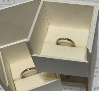 箱付きで頂きました。Vのようなデザインとダイヤが複数付いているデザインが気に入りました。最初はこのようなデザインは候補に入っていませんでしたが、指になじみやすくオシャレ感のある形だと思います。内側には無料で名前のイニシャル刻印をして頂きました。