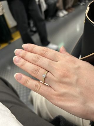 とにかく付け心地が滑らかなのでとても良いです。 さらにピンクゴールドの銅の割合の関係で、ピンク感が強いわけではなく、指に馴染みます。 一粒ダイヤの付きかたにもこだわりがあるそうで、とてもおしゃれな指輪です。