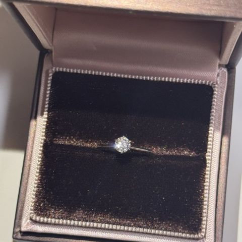 憧れの婚約指輪ということで、好きを詰め込んだデザインです。大粒の真ん中のダイヤが目を引くデザインで王道感があると思っています。また、真ん中のダイヤの横に2つダイヤがついていて更にゴージャス感があります。