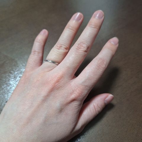 水かきが深めで細長い指なので、店員さんにウェーブか少しV字めの指輪を勧めていただきました。他にも十種類位試着をさせていただきましたが、こちらの指輪が一番着け心地がよく、日常生活で使うのにぴったりだと思いました。シンプルすぎず、派手すぎず、といったデザインを探している方におすすめです。