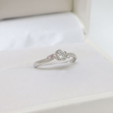 デザインは普段使いしやすいように高さの出ない物から選び、相手がお花が好きということもあり、このデザインにしました。また、ピンクダイヤを取り扱っているお店ということもあり、色の濃さが違うピンクダイヤを2つ入れました。
