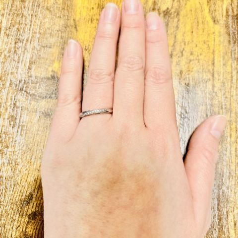 シンプルで上品なデザインで、高級感があります。 ハーフエタニティのメレダイヤがとても綺麗で、スーパーのような、日常よく行くお店のライトの下でもキラキラして綺麗なのでお買い物に行くだけでも楽しくなります。単体でつけるのももちろん素敵ですが、婚約指輪との重ね付けをしても、婚約指輪を引き立ててくれます。