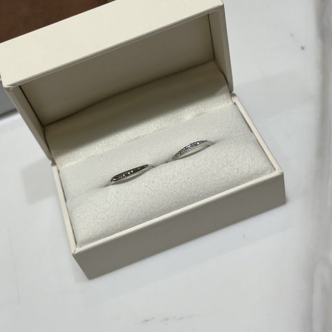 女性側はダイヤモンドが沢山散りばめられていてデザインが可愛くどの角度でもダイヤモンドが輝いて見えていてお気に入りです。男性側も少しウェーブかかっていて婚約者もお気に入りとの事でした。末長く着用していきたいです。