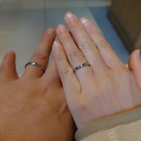 ウェーブがかっているデザインを希望で、 夫の指輪にはウェーブを境に、半分下をマット加工を入れてもらいセミオーダーにしました。 私の指輪は婚約指輪は購入してないので、ダイヤの主張がある程度あるものがいいと言う事で、最初は大きなダイヤが3つ連なってるものにしましたが、服にひっかかりほつれてしまったり、髪にひっかかって左側だけ傷んでしまっていたりしました。 購入して3ヶ月程で紛失してしまい、それを機にデザインを同じシリーズの別のものに変更して購入しました。 ウェーブに沿うようにダイヤが線状に埋め込まれてて、日常生活に差し支えないくらいにキラキラしてくれているのでとても気に入っています。