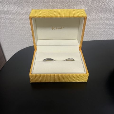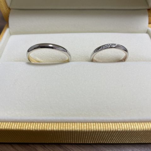 彼がシンプルな平打ちの指輪を希望していて、こちらになりました。既成のデザインから太さ等自分好みに変えてもらうことができ、より完璧なデザインになりました。 女性側もダイヤがついていて、なかなか他にないデザインなのでお気に入りです!