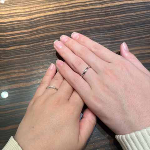 滑らかなウェーブが細身の指をより綺麗にみせてくれます。女性側の方は婚約指輪とも重ね付けができるよう、ダイヤの位置がサイドに広がっているので、横からの角度でも結婚指輪がキラキラと見えます。普段装飾品を身につけない夫の指にもしっかり馴染み、お互いの指輪を見るたびに2人でこれから歩んでいこうと言う気持ちにさせてくれます。