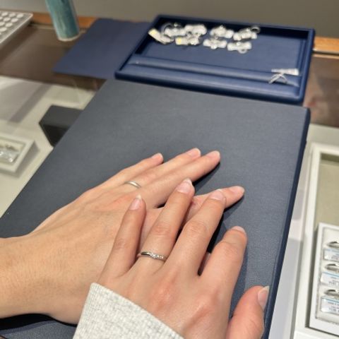 女性側はダイヤの輝きが色々な方向から見えて形もS字なのでどの角度でも綺麗に見えました。男性側もS字のデザインなのでシンプルすぎずよかったです。 相手側から見たときに見え方も指が綺麗に見えることやここでしか買えないブランドだったので決め手になりました。