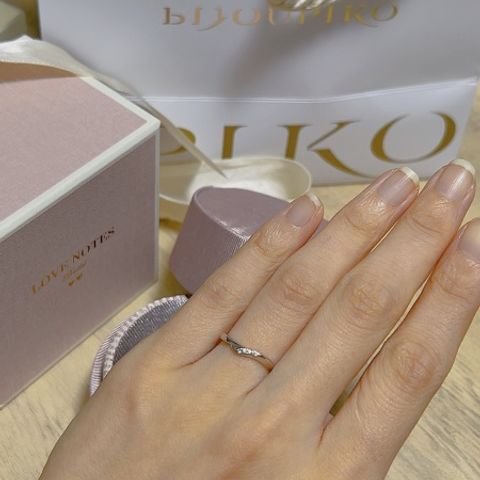 つけ心地がとてもよいです。ストレートやVのリングも試着しましたが、ウェーブが自分たちの手にはしっくりきたので、こちらのリングを選びました。またダイヤモンドの輝きがとても美しく、キラキラ輝くたびに幸せな気持ちになります。
