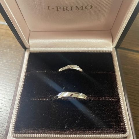 微妙なうねり具合が指にとてもフィットし、本当に着け心地がよいです。旦那さんの指輪とペアデザインで、女性用のダイヤの部分だけツヤ消し加工してもらい、より一層ペア感がでたところがとてもお気に入りなところです。