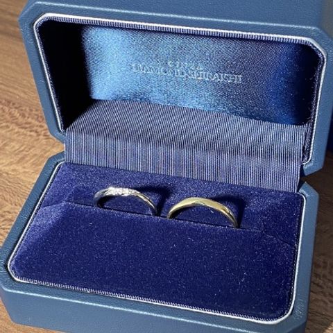 ダイヤモンドにこだわってるブランドだからこそ、ダイヤモンドが多く入っている指輪にしました。何ヶ所ものブランドを回りましたが、他のブランドにはないデザインで、指も綺麗に見えるのでとても気に入ってます。 男性の指輪もシンプルなものではありますが、鍛造製法で、強度が強く、仕事中も安心してつけることができます。