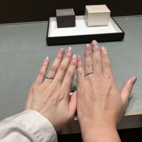 2人の手の特徴に似合うデザインのものを選んで大変満足しています。両端のダイヤがとても綺麗です。いろいろ試着させて頂いてデザインと付け心地で迷いましたが、ずっとつける物なので付け心地が良かったものを選びました。