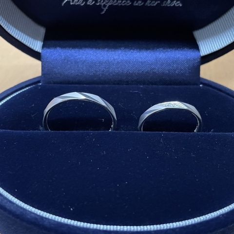婚約指輪は普段も使用したい為、ハーフエタニティにしました。とても綺麗です。 結婚指輪は種類は違いますが両方素敵で着け心地がいいです。 彼は指がゴツゴツとしているので太めのリングを探していたところ似合うリングがありかっこよかったです。 レディースは指が綺麗に見える指輪をスタッフさんに持ってきて頂きました。婚約指輪と重ねてするとキラキラと綺麗で素敵です。