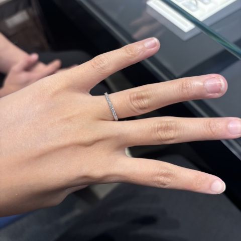 婚約指輪もヴァンドーム青山で購入しました。 婚約指輪と重ね付けしたかったので、斜めにラインが入っているデザインにしました。 ダイヤの幅も選べたのですが、婚約指輪と同じ幅になるものを選択しました。キラキラで可愛いです。今から着けるのが楽しみです。