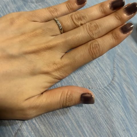 指輪自体の細さや、形が指が綺麗に見えるデザインです 手を動かすたびに光るダイヤモンドもすごく綺麗で、王道の結婚指輪です 指輪の形がウェーブですが、形が曲がりすぎず自分の指にすごくフィットするデザインで馴染みやすいです