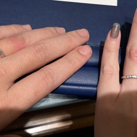 相手(男性側)はデザインを気に入り、すぐに決まりましたが、わたしは最後2択で非常に迷ってしまいました。 対応いただいた店員さんが、実は2択のうち1つが相手のものとペアであることを教えてくれ、決め手になりました。お互いデザインが気に入っており、届くのが楽しみです。