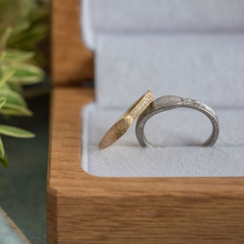 スタイリッシュと感じたローレルで作製いただきました。 同じデザインでも石の有無など、お互いの好みを選択できるので、お互いが満足できる指輪を作製できました。 シンプルだけど個性的で、とても素敵です。 ダイヤモンドマットのテクスチャーがお気に入りです◎