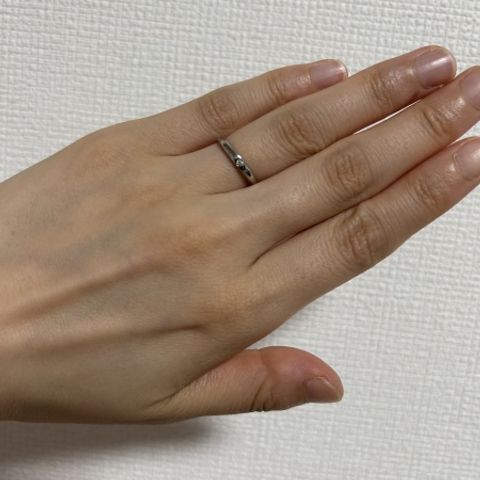 シンプルな点が非常によく、着け心地も抜群でとても良い仕上がり。 プラチナの品質も良いらしく、価格、品質、付け心地全てが揃った素晴らしい指輪だと感じる。 婚約指輪も、ダイヤとリングのデザインがマッチし、親和性を感じるデザインで自然で良い