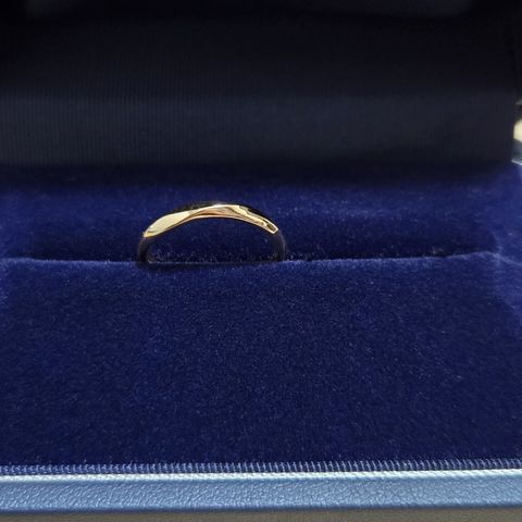 ただのシンプルリングに見えるが、ウェーブしていて綺麗な形です。 色をピンクゴールドにしたので一見ゴールドに見えるけど、肌馴染みが良いです。 中の印字をイニシャルと笑顔のマークを入れたので可愛いのですが、細かったので見えづらく残念になってしまいました...