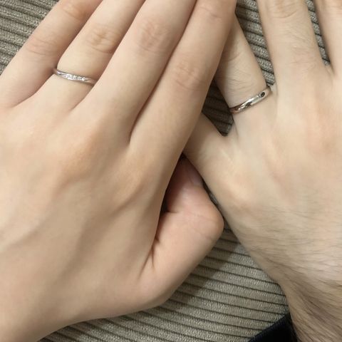 HPで見た時は候補にいれていなかったものですが、実際にお店で試着してみると派手すぎないキラキラ感と若干ウェーブした形が女性らしくてとっても気に入りました!彼が気に入った指輪は違うシリーズのものでしたが、バラバラで選ぶこともできるとのことでお互い自分の好きなデザインを選ぶことができました。