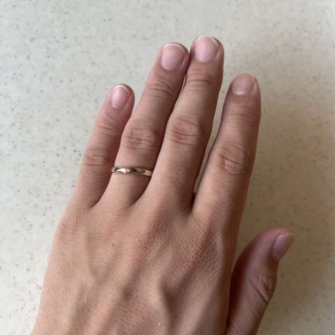 デザインがシンプルかつ綺麗で、日常生活で浮かない指輪を探していた私にぴったりの指輪でした。 指を細く長く綺麗に見せてくれる素敵なデザインで、最初の試着からずっとお気に入りのひとつでした。 婚約指輪との相性もよかったです。