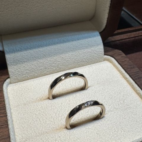 お互いウェーブデザインで探しており、こちらの指輪がしっくり来たので決めました。ダイヤがもう少し控えめのものと迷いましたが、キラキラしてテンションが上がるため、こちらに決めました。ダイヤが入っているものの、派手過ぎず身につけやすいです。