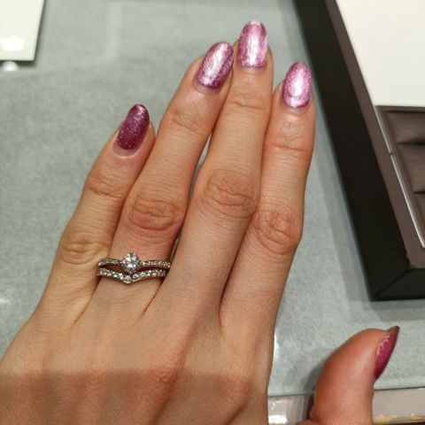 他のショップにはあまりないデザインで、わたしの手の形にとても合っていたので購入しました。ダイヤモンドが流れるようにあしらわれていて、手の形がとてもきれいに見えました。細めのデザインで女性らしさが溢れる指輪でした。