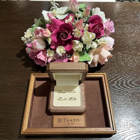 和風のデザインでシンプル、でも他の人と被らない2人オリジナルの指輪を付けたいなと思いTANZO.さんにお願いしました。デザインや刻印それぞれ色んな種類があり、私達は和紙加工のデザインがとてもいいなと思いそれに少しアレンジして造って頂きとても素敵な指輪を造って頂きました。