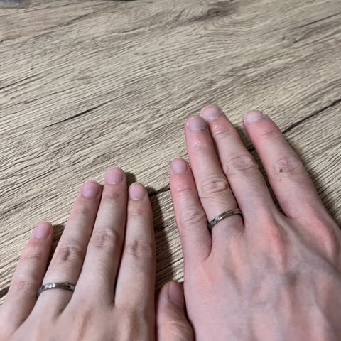 指輪な形は平打ちと甲丸で異なる形だが、ヘアラインを入れたことによって統一感を出している。 指輪の太さも1ミリ単位で調整することができるので、オリジナル感を出すことができる。 結婚指輪感をどうしても無くしたかったので、日常使いができるシンプルなマットデザインにしました。