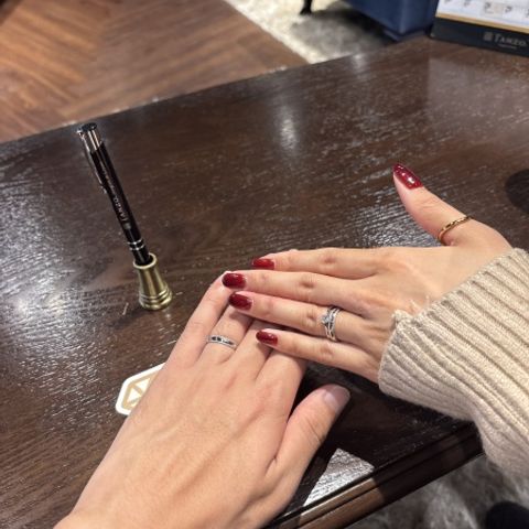 デザインはもちろんですが、今日までの私たちの話をたくさん聞いてくださり思い出をつめた指輪を選ぶことができました。違う種類でもリンクさせて統一感を持たせることのできた指輪を選ぶことができてよかったです。