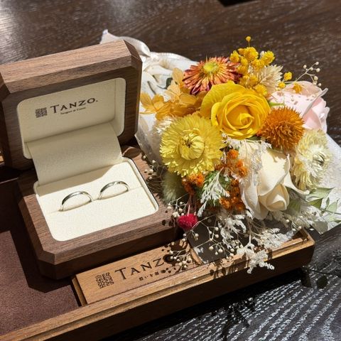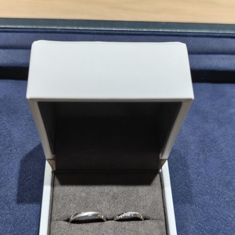 ペア感を出したくてフルオーダーのオリジナルデザインにしました。 鍛造のしっかりした作りで、着け心地も抜群です。担当の方からアドバイスをいただきながらお互いの好みを反映しつつ、大満足な仕上がりになりました。世界にひとつの指輪になりました。ウォールナットのケースも素敵です。