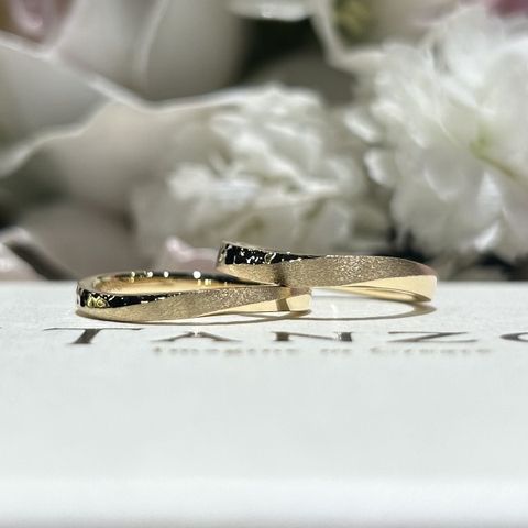 ちょっと厳し目の職場でも毎日つけられるデザインにしました。歪みのあるデザインも気になっていたのですが、話し合ってストレートだけど変化のあるデザインにしました。優しいマット加工が映えていてとても気にいっています。