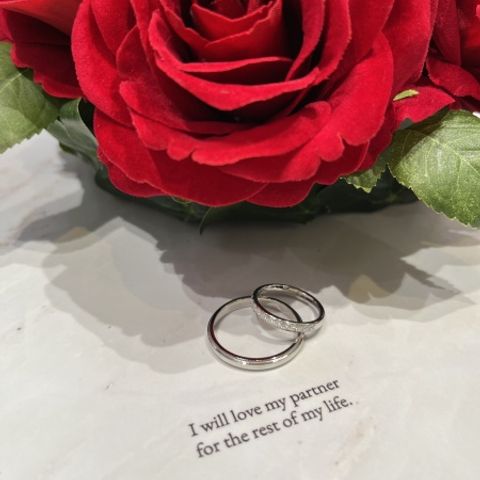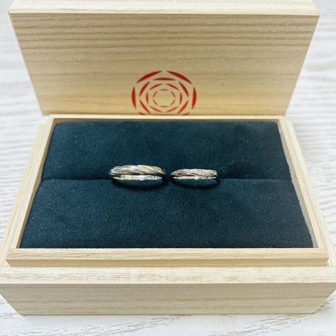 私たちの結婚指輪は、フルオーダーメイドで一からデザインを考え、お互いの好みや想いを丁寧に形にしました。ペアとしての一体感を大切にしながらも、それぞれの個性が活きるよう細部にこだわり、同じ素材やモチーフを使ってふたりだけの共通点をさりげなく表現しています。世界にひとつだけの指輪は、私たちの絆や歩んできた時間、そしてこれからの未来を象徴する大切な存在になりました。
