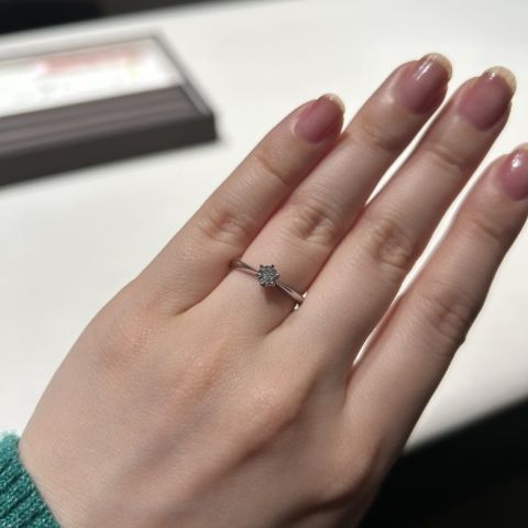 シンプルな結婚指輪にしたかったので、婚約指輪もテイストを合わせてシンプルなものを選びました。完成品はダイヤが目立つ印象で、とても気に入っています。また、細いものの強度が高く、ヒヤヒヤせずに安心してつけられます。