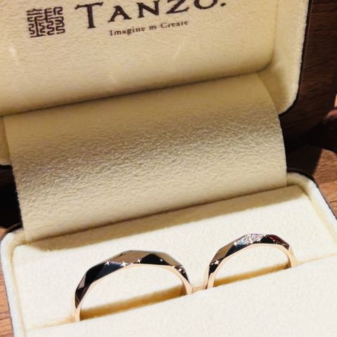 TANZOオリジナルの色味であるコーラルゴールドにしました。肌に馴染む感じが気に入ってます。 表面はひし形にカットして鏡面加工しています。 妻の方にはダイヤを入れました。 よくあるデザインではなく、オリジナルが良かったので、フルオーダーで選びました。
