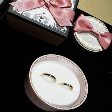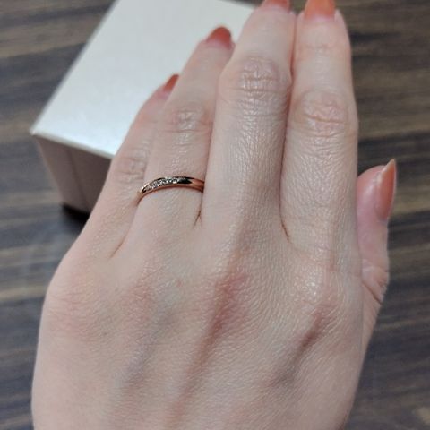 華やかでも落ち着いた雰囲気が気に入っています。 また、着け心地が良く、 ピンクゴールドが入っていることで、肌馴染み良いです。 指輪の金属部分の加工方法が、 それぞれ選べるのも魅力的でした。 鏡面だとピカピカして華やかに仕上がりますが、 私は優しい雰囲気が好きなので、ホーニング加工でお願いしました。