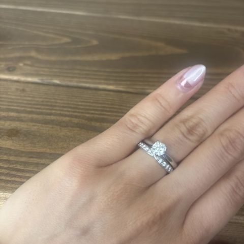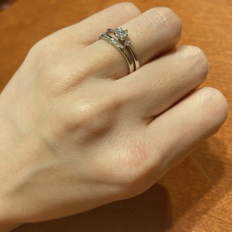 来店する前からいいなと思っていた指輪を、実際に着用させていただきました。他のデザインも見せていただきましたが、あまり悩まず今回のデザインに決まりました。ダイヤが斜めに入っているので特別感もありつつ、ギラギラしすぎないので普段使いもできそうで気に入っています。