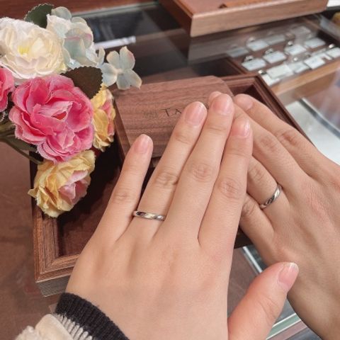 毎日つけていたいので、永くつけられるデザインで、かつ、シンプル過ぎないものを探していました。また、ゴルフをお互いにするので、プレー中にも気にならないダイヤなどが施されていないデザインで、丈夫なものを探していました。この指輪を見たときは、2人で即決でした。