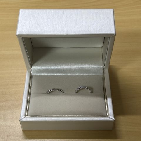 私の指輪は派手過ぎず、普段使いできて、ダイヤモンドが埋め込まれている為家事をする時も外さなくてよいデザイン、夫の指輪は1部つや消しをしてもらっており、キラキラし過ぎず、手に馴染むデザインにしてもらった。
