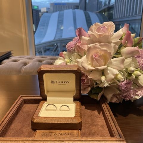 シャンパンゴールドという色にしていただきました。 落ち着いた色味でとても綺麗です! なかなか取り扱いの無い色ということなので、ぜひお試しいただきたいです。 写真では見えにくいですが、指輪の内側に埋め込んでいただいたお互いの誕生石もお気に入りのポイントです。