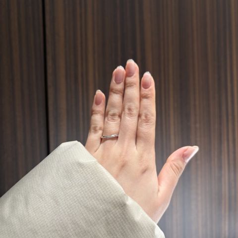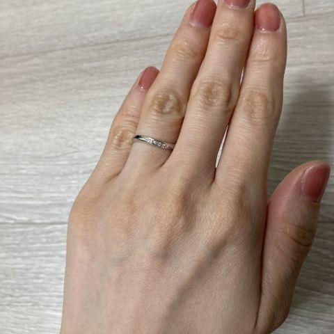 水かきが深めで細長い指なので、店員さんにウェーブか少しV字めの指輪を勧めていただきました。他にも十種類位試着をさせていただきましたが、こちらの指輪が一番着け心地がよく、日常生活で使うのにぴったりだと思いました。シンプルすぎず、派手すぎず、といったデザインを探している方におすすめです。