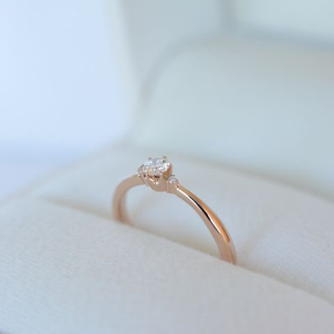 ダイヤモンドの品質はもちろん、どの角度からみても輝いて見える所がお気に入りです。特に横からみるサイドビューが素敵だなと思います。セットリングなので結婚指輪とセットで付けることで、より素敵で魅力的にみえる指輪になります。