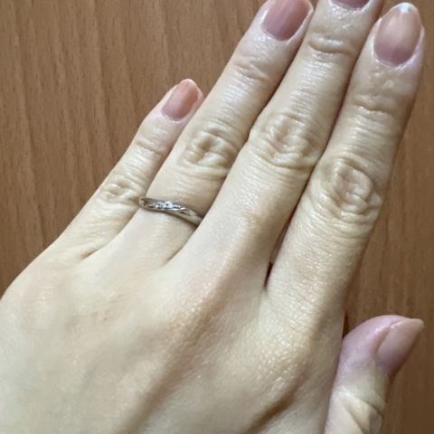 ウェーブで華奢な感じに見えるのがいい。 婚約指輪がなく、重ねつけすることがないので、ダイヤモンド多めのものを選びました。 ゴールドとプラチナで迷ったが、プラチナの方が指輪の種類が豊富で選べる選択肢が多かった。
