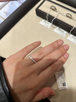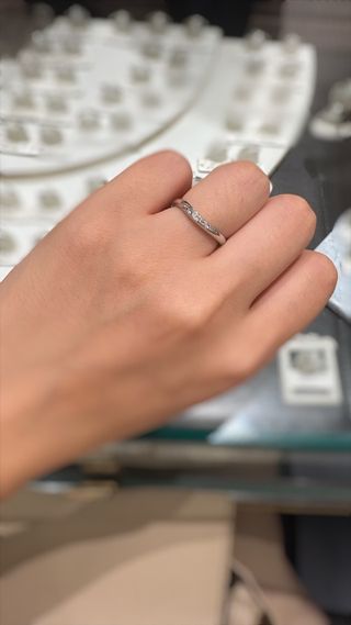 ダイヤモンドの輝きがとても素敵です。当初石の無い指輪を探していましたが、こちらの店舗でキラキラとした指輪をみていると考えがすぐに変わりました。一つの輝きがすごいので見本では3つあった石を1つだけに変更しましたが、とても満足です。かわいいです。