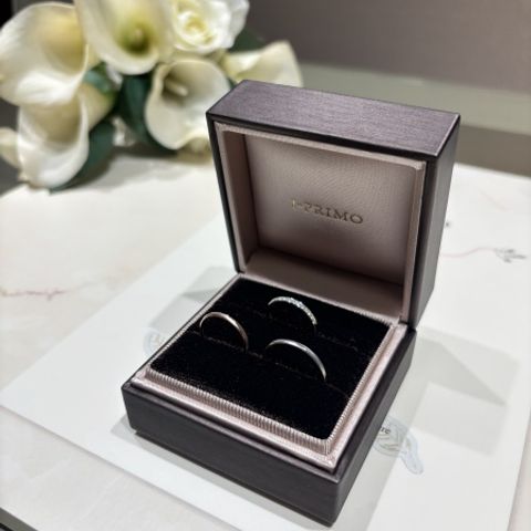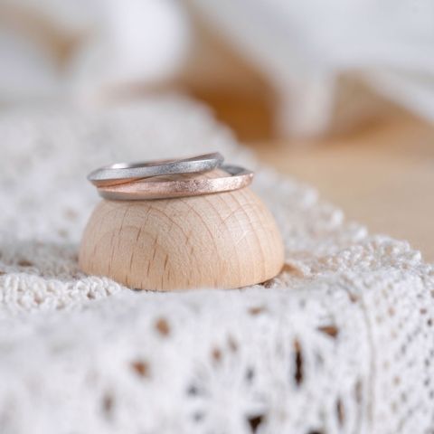 無理にお揃いの同じデザインではなく、お互いに別々のデザインを選択して、毎日つけたいお気に入りのリングに仕上がりました。 内側の素材も別々の色味を選択しています。それでも並べた時には統一感があります。 女性用のほうが男性用より幅広でカジュアルなデザインにしました。つけている時に存在感がありつつも、キラキラし過ぎないヘアライン加工を入れています。