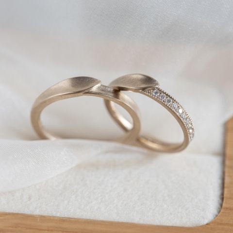 色々と試着する中で、ユッカというデザインが一番しっくりきました。色は、イエローゴールドより少し控えめな落ち着いた色味を希望していたので、シャンパンゴールドにしました。テクスチャは、レディースは少しアンティーク感のあるダイヤモンドマットにダイヤを3粒、お任せで入れて頂きました。光の当たり具合によってキラキラと輝くので見ていて飽きません。メンズはブラシマットです。お揃い感があり気に入っています。