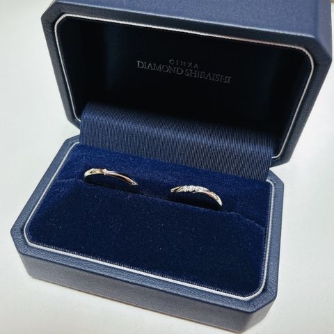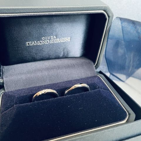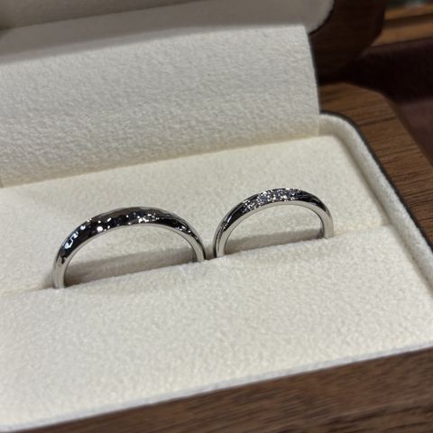 水鏡という名前、ふたりの美しい未来を表したというコンセプトに、2人して惹かれました。プラチナを使用しかつしっかり太さのある指輪なので、鏡面部分で存在感があるのと、歳をとって指が細ってしまってもカバーしてくれそうだなというのも決め手でした。新婦用はメレありで、左上側にのみ入っているので、見る角度や相手によって印象が変わるのが素敵です。いわゆるVラインに当たると思いますが、着けているとさほどそんな感じはせず、オリジナル味のあるデザインだなと思っています。新郎用はヘアライン加工ありのものをチョイス。男性らしい無骨さがあるデザインながら、ヘアライン加工により落ち着きも感じられます。