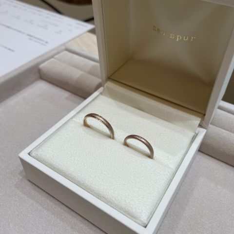 S字カーブ、荒目マット、面取りを揃えてペア間が出るようにして頂きました! 2人でデザイン出来て、職人さんがひとつひとつ丁寧に作ってくださるので、唯一無二の私たちだけの指輪になりました! 地金の種類も豊富で、肌の色に合うピンクゴールドが選べたのが嬉しかったです!